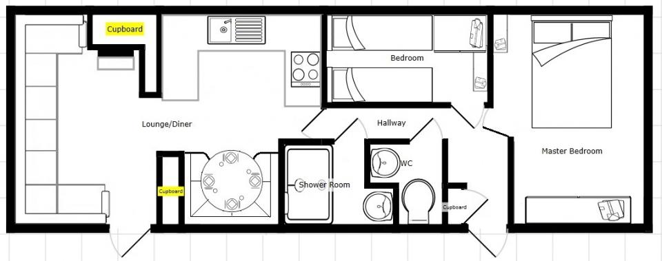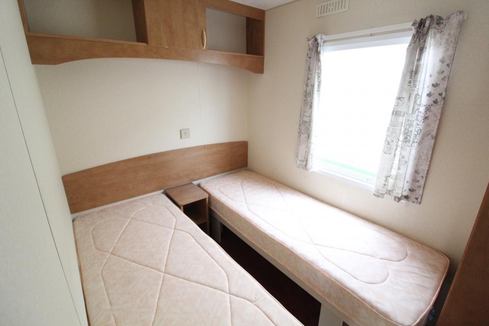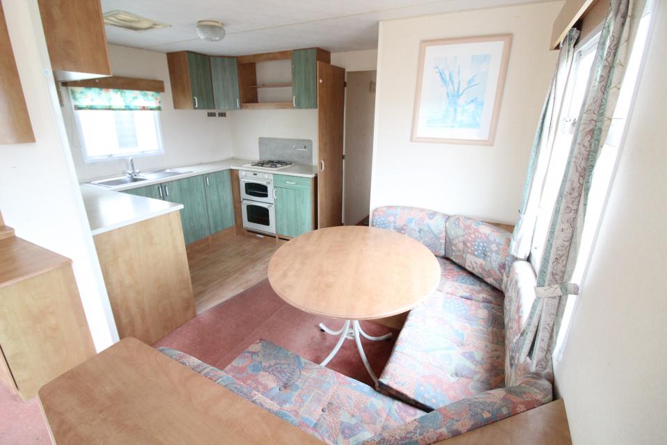 Una caravana de 2 dormitorios de 3,6 metros de ancho. El salón tiene asientos fijos con chimenea de gas GLP. El comedor tiene asientos fijos y una mesa independiente. Cocina amueblada con hornillo de gas GLP y buen almacenaje. Cuarto de baño y WC separados. Un dormitorio con dos camas individuales y un dormitorio doble. Una caravana del 2000.