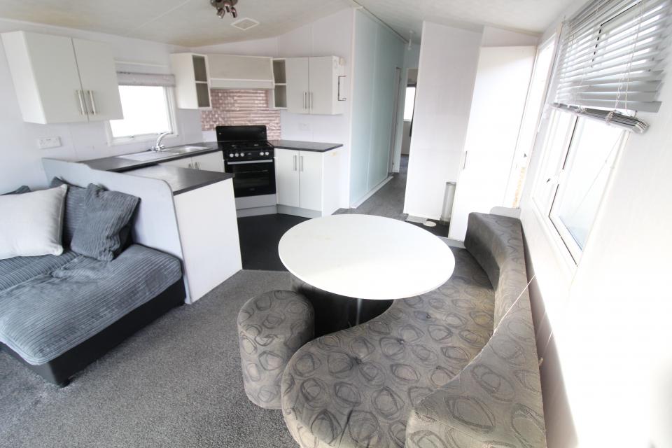 Una caravana de 2 dormitorios de 3,6 metros de ancho. Doble acristalamiento. El salón cuenta con muebles independientes, techo a dos aguas y chimenea eléctrica. El comedor tiene una mesa y asientos independientes. Cocina amueblada con vitrocerámica de gas GLP. El cuarto de baño está equipado con lavabo, inodoro y ducha grande. Un dormitorio doble con literas. Un dormitorio doble con aseo en suite. Una caravana del año 2012.