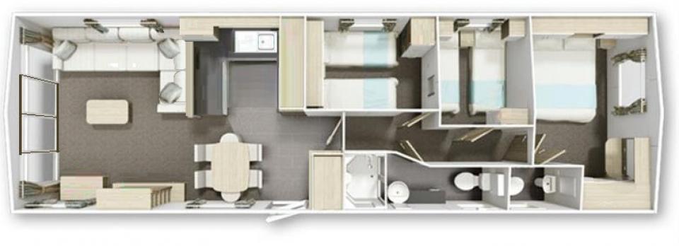 Una caravana de 3 dormitorios de 3,6 metros de ancho. Climalit y calefacción central de gas GLP. El salón tiene asientos fijos, chimenea eléctrica, techo a dos aguas y puertas correderas delanteras. El comedor tiene una mesa y sillas independientes. Cocina amueblada con hornillo de gas GLP y buen almacenaje. El cuarto de baño está equipado con lavabo, inodoro y cabina de ducha grande. Dos habitaciones dobles y una habitación principal con baño en suite. Una buena caravana del 2013.